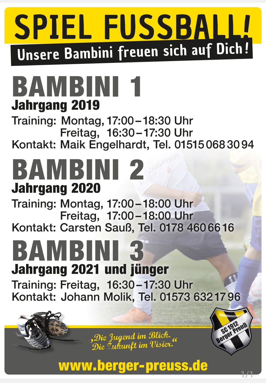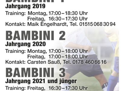 Der SC Berger Preuss lädt alle fußballbegeisterten Kinder der Jahrgänge 2019 bis 2021 und jünger herzlich zu den Bambini-Angeboten ein. Gerade für die ersten Schritte im Fußball bietet der Verein ein spielerisches und altersgerechtes Umfeld, in dem Bewegung, Freude und Entwicklung im Mittelpunkt stehen.